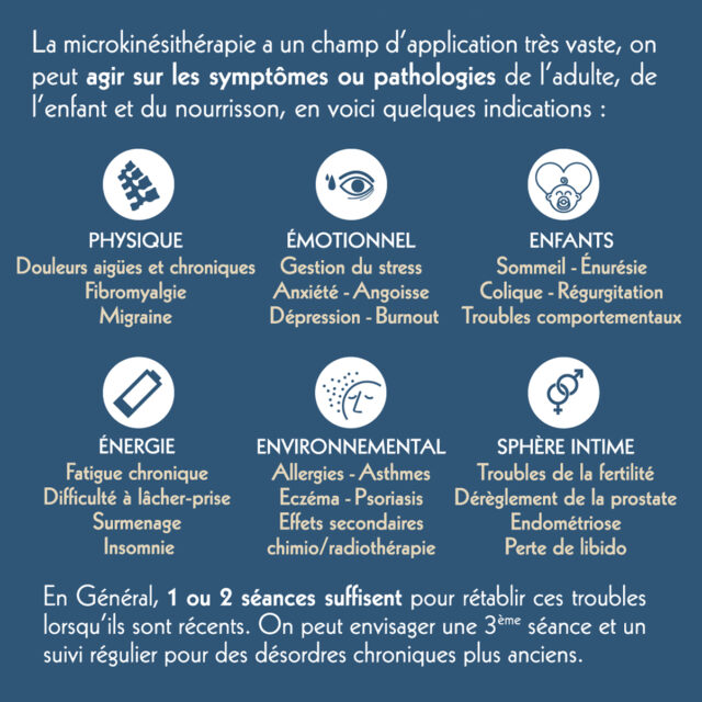 La microkinésithérapie vise à identifier ces perturbations afin d’aider le corps à relancer ses mécanismes naturels de correction.